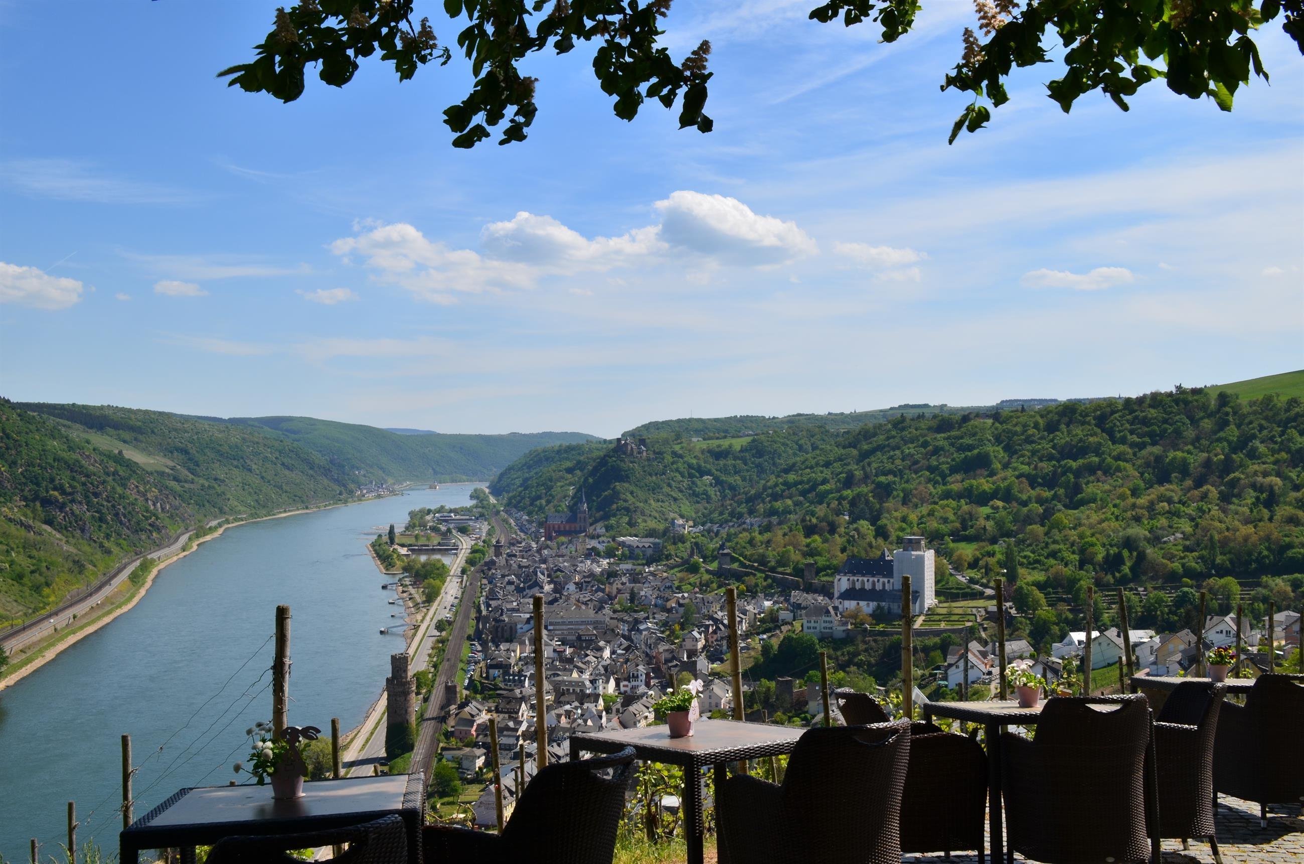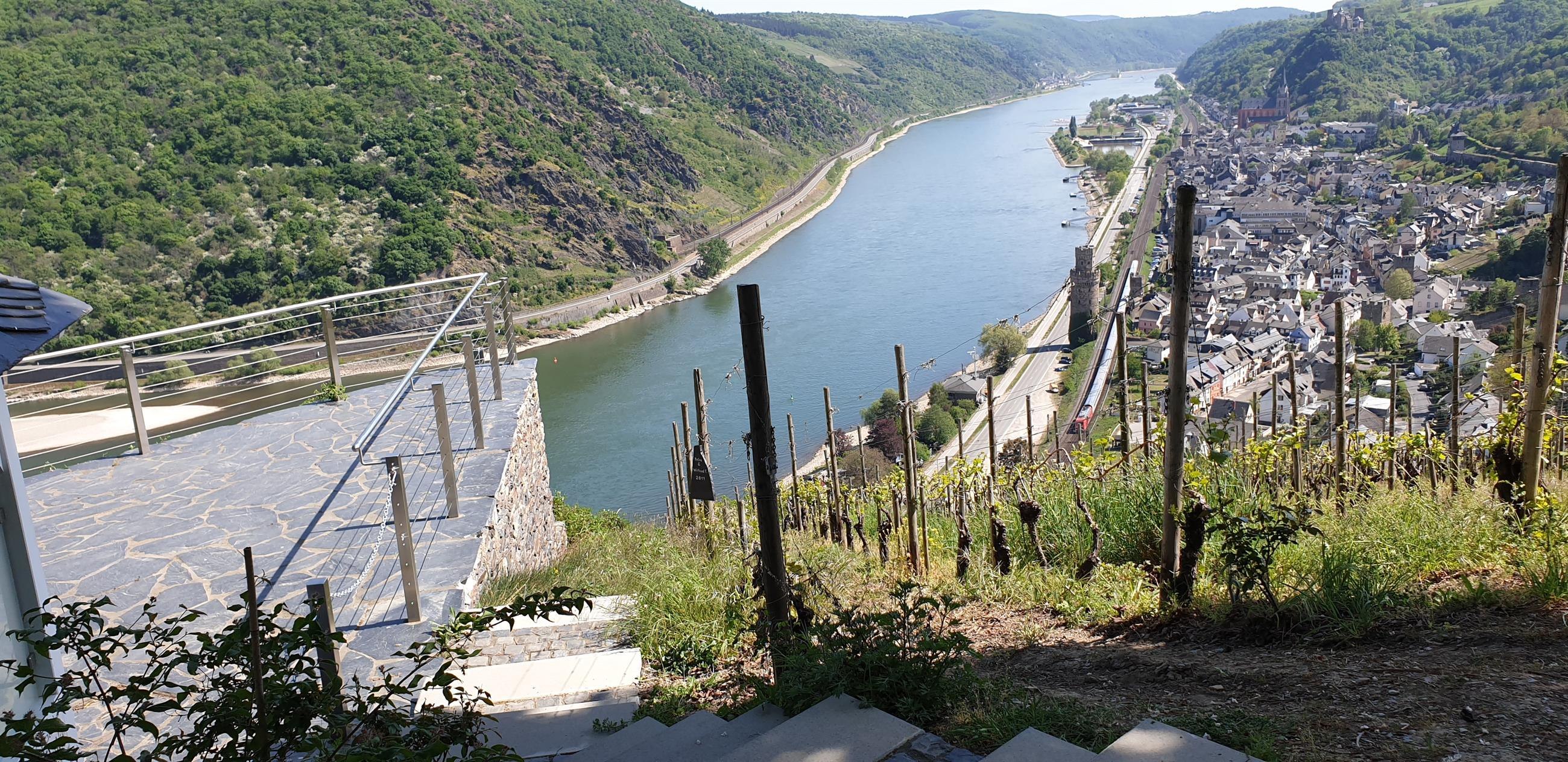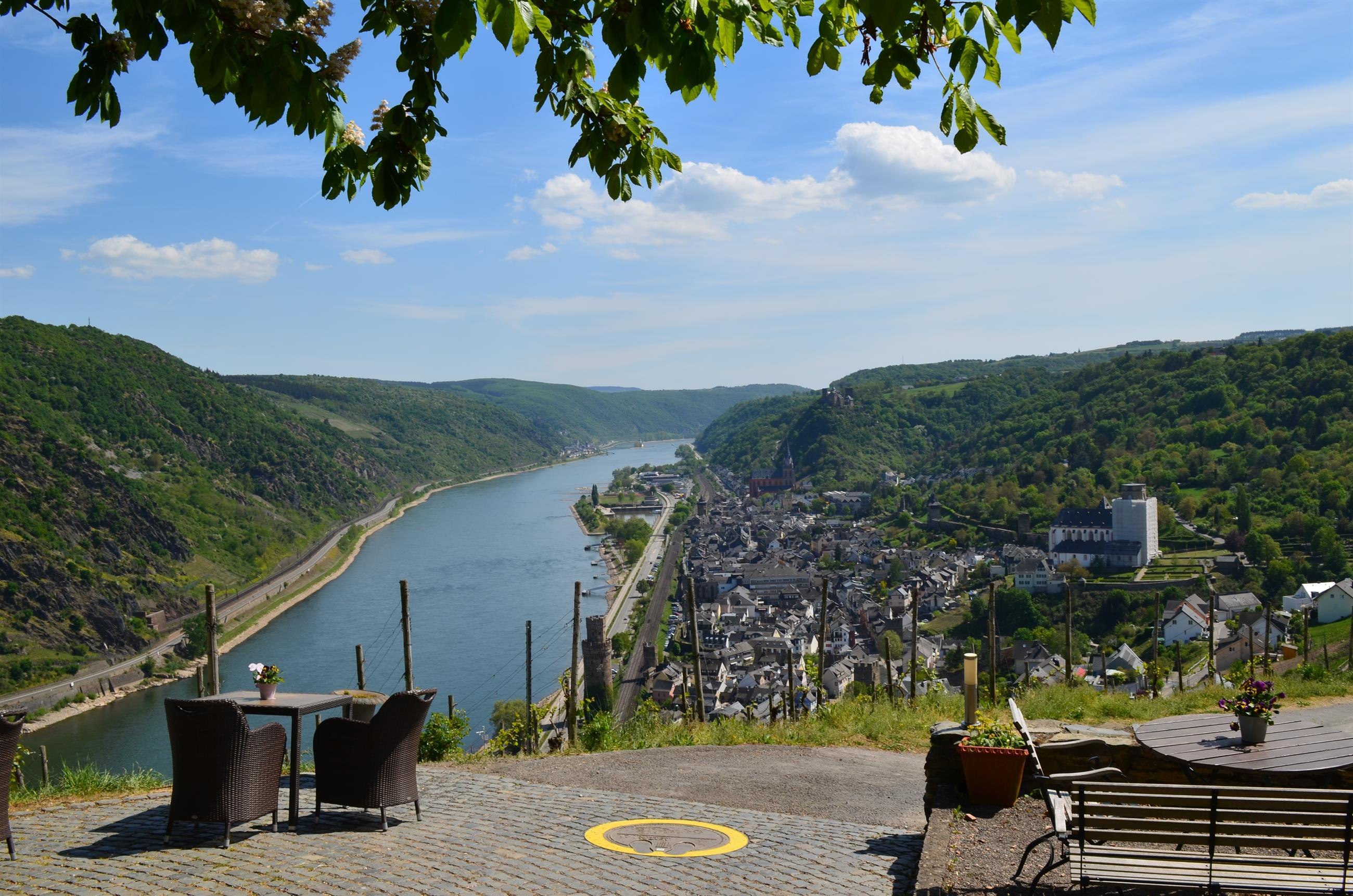 Grandioser Fernblick ins Rheintal, auf die Burgen Schönburg, Pfalzgrafenstein und Gutenfels sowie die Stadt Oberwesel. Bei Niedrigwasser tauchen, nach einer Sage, die Sieben Jungfrauen (Felsformation) aus dem Rhein auf. Parkplatz ca. 50 m entfernt. Direkt am RheinBurgenWanderweg gelegen.