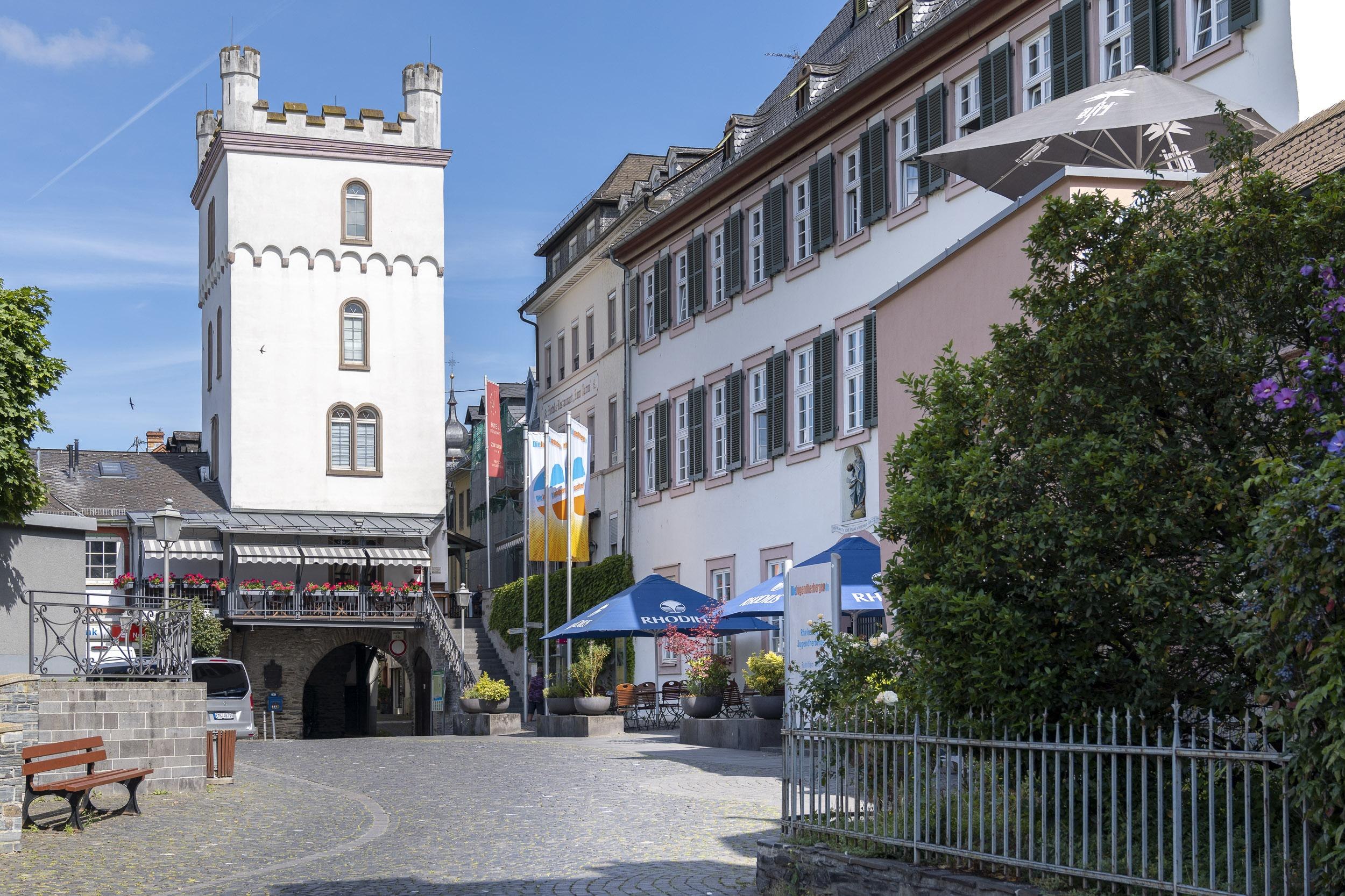 Die Stadtmauer wurde wohl in der 1. Hälfte des 13. Jahrhunderts, gleichzeitig mit der Burg, angelegt. Die älteste Umwehrung sicherte das ,,Städteviertel" von der Kirche bis zum Mainzer Torturm. Die Rheinfront war wohl schon seit dem 13. Jahrhundert inseitig mit Wohnhäusern bebaut; die Überbauung des Wehrganges erfolgte erst seit dem 17./18. Jahrhundert. Aus der im Wesentlichen erhaltenen Mauerflucht springt die Kirche bollwerkartig vor und scheint daher jünger zu sein.