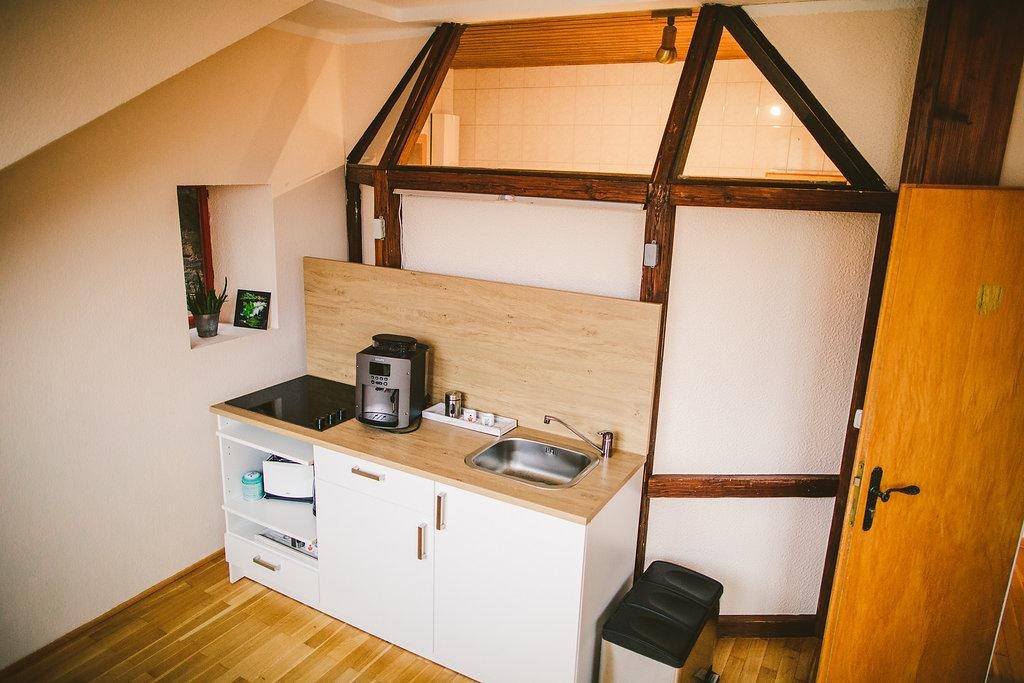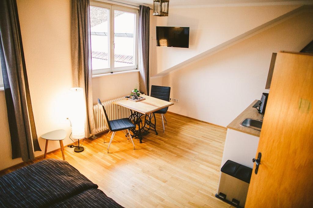 Komfortable Möblierung und eine moderne, liebevolle Ausstattung erwarten Sie in unseren klimatisierten Ferienwohnungen im Dachgeschoss des historischen Hauses. Die Küchen sind mit Kaffevollautomat, Geschirr, Wasserkocher, Toaster usw. ausgestattet.