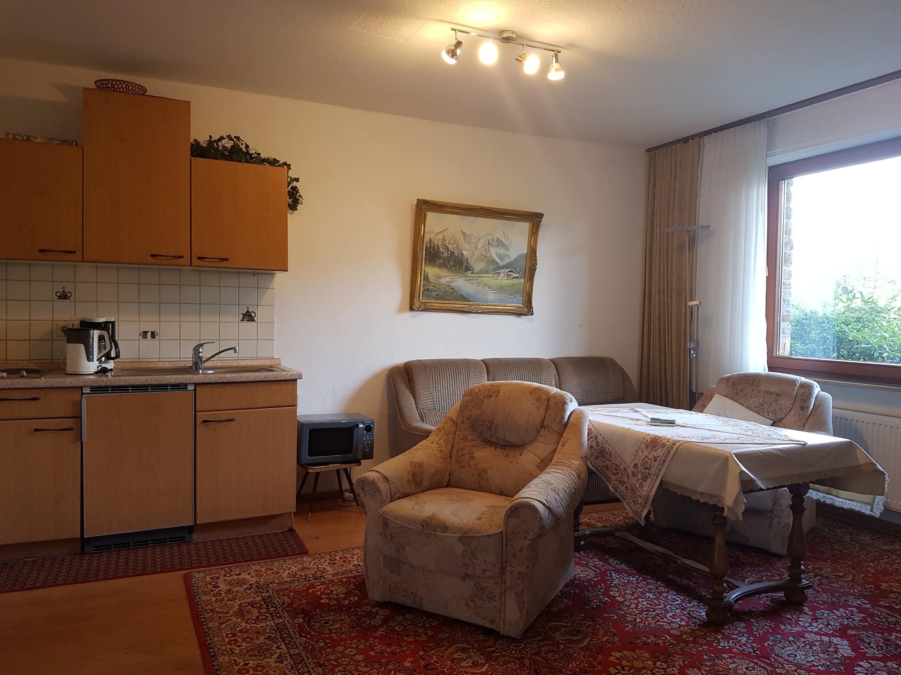 Das Appartment (42 qm) besteht aus einem Schlafzimmer mit Dusche und WC ensuite und einem Wohnzimmer mit Küchenzeile.