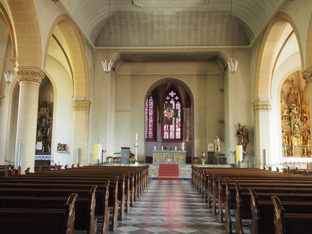 Älteste Bauteile der Kirche sind die um 1190 erbauten spätromanischen Chorflankentürme, die zu einer ehemaligen Basilika gehörten. Der gotische Chor mit zwei Kreuzgewölben entstand 1332, das barocke Mittelschiff im Hallenstil 1775-77. Die Seitenschiffe mit den Seitenchören wurden 1895-99 angefügt. Trotz der vielen Baustile erscheint der Kirchenraum als harmonisches Ganzes und beherbergt u.a. eine wertvolle Stummorgel aus dem Jahre 1742. In den beiden Glockentürmen befindet sich ein repräsentatives Glockengeläut mit einem Gesamtgewicht von 13,6 Tonnen.