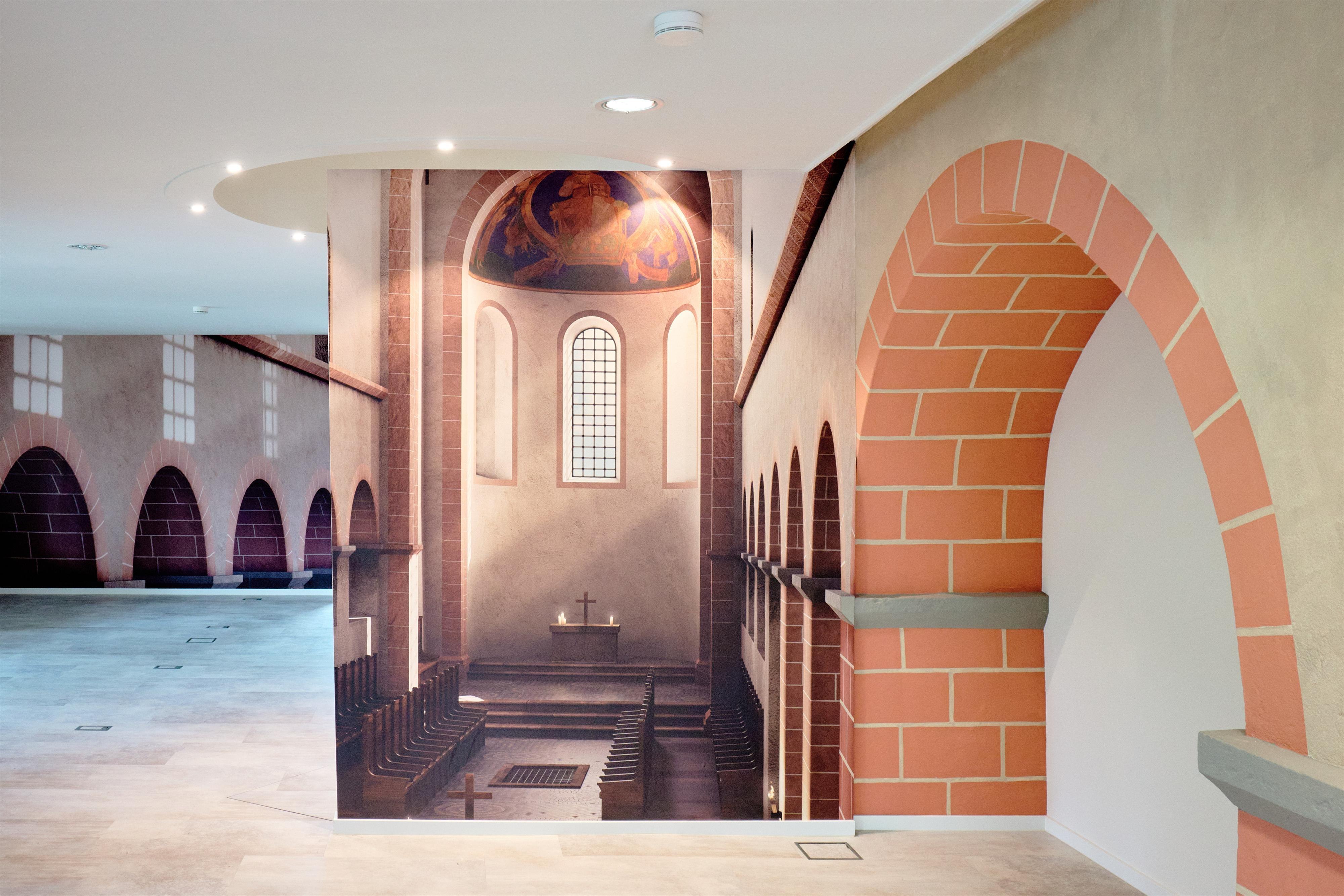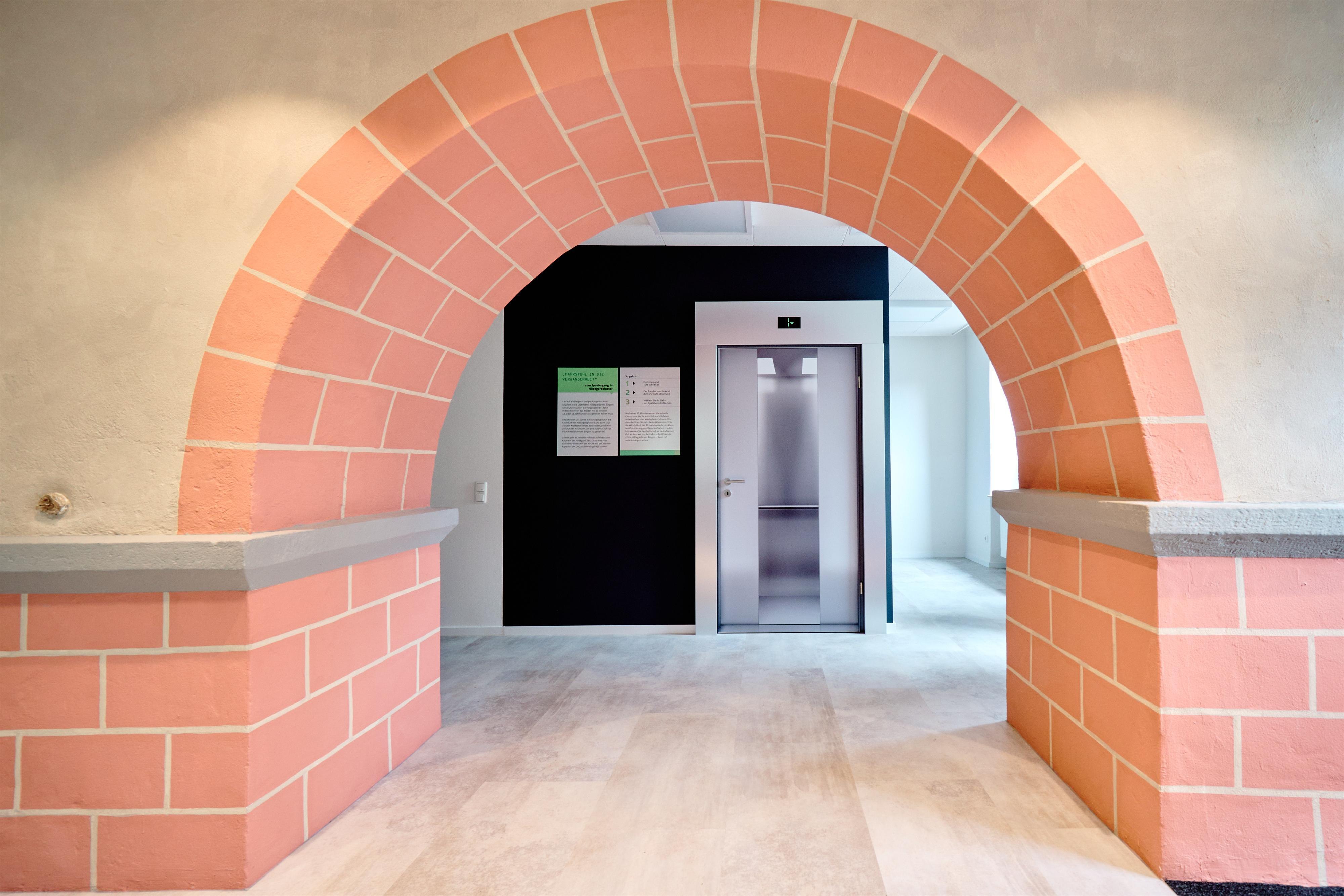 Der „Fahrstuhl in die Vergangenheit“ fährt mitten hinein in das Kloster, wie es im 12. oder 13. Jahrhundert ausgesehen haben mag. Zuerst geht es abwärts auf das Laufniveau der Kirche in der Hildegard-Zeit. Dann entscheiden Sie, wie es weitergeht: Zuerst ein Rundgang durch die Kirche, in den Kreuzgang hinein und dann raus auf den Klosterhof? Oder doch lieber gleich hinauf auf den Kirchturm, um den Ausblick auf das hochmittelalterliche Bingen zu genießen?