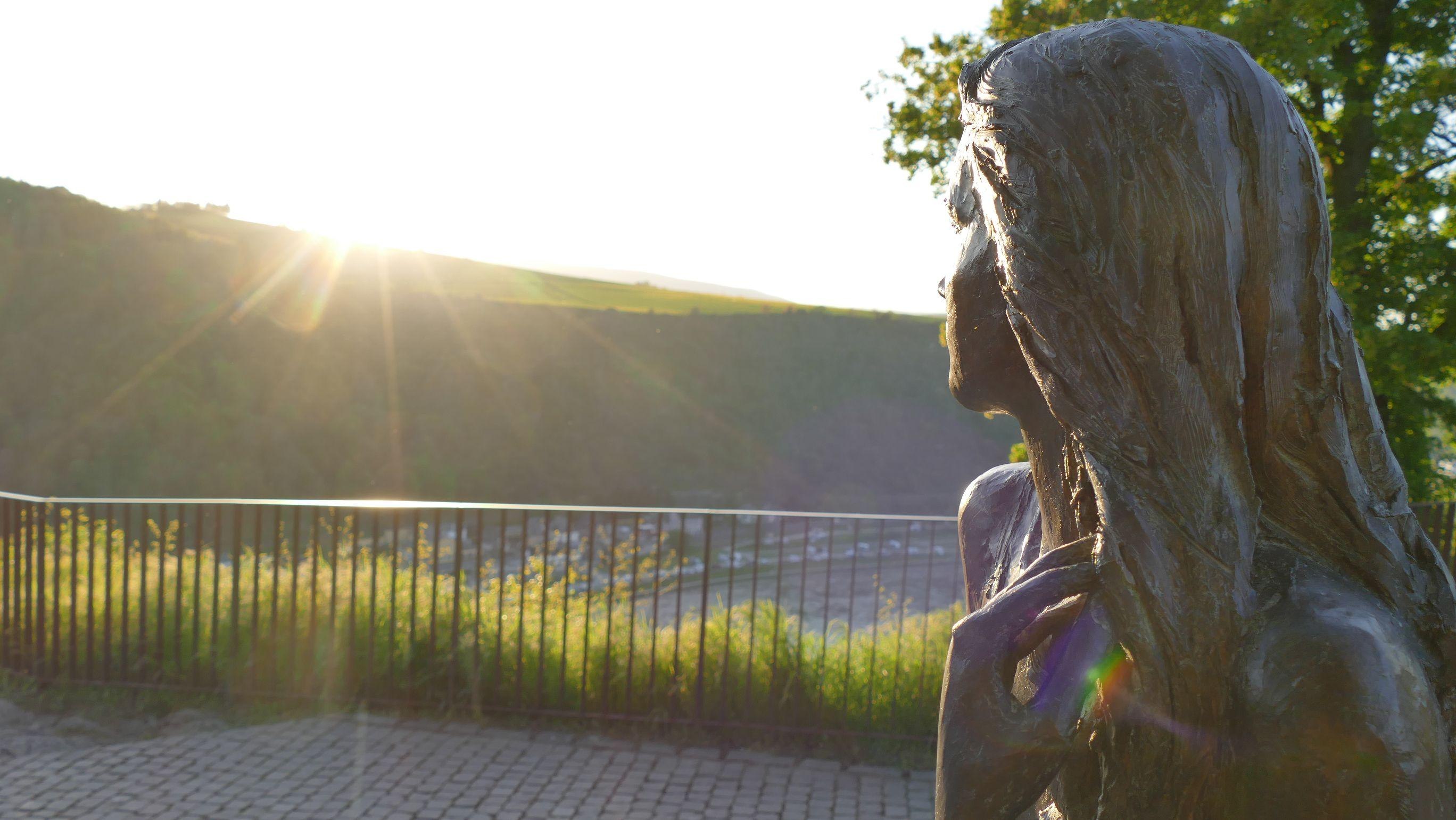 Die Loreley. Sie hat unsere Umgebung weltberühmt und zur Attraktion gemacht. Seit Frühjahr 2023 gibt es die neue Loreley Skulptur auf dem Loreley Plateau. Die 2,20 m hohe Plastik stammt von der Berliner Bildhauerin Valerie Otte, deren Entwurf sich im Rahmen eines nationalen Realisierungswettbewerbs mit Bürgerbeteiligung unter insgesamt mehr als 50 Mitbewerbern durchsetzen konnte. Valerie Otte zeigt die schöne Loreley klassisch auf einem Felsensockel und stattet ihre Figur mit etlichen Insignien der Loreley Geschichte aus. So ähnelt ihr wallend-fließendes Haar einem Flusslauf. Die Künstlerin betont in ihrer Version der Loreley jedoch weniger das schaurige der Gefahr, die sie der Sage nach für die Schiffer darstellt. Sie versucht eigenen Worten zufolge eine "feminine Sicht auf die Loreley" zu zeigen - als Frau, die ihrem Liebsten nachtrauert und "sehr in sich und ihre Gedanken versunken" ist.