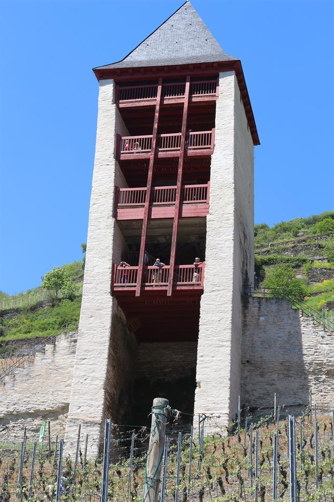 Ursprünglich handelte es sich um einen ehemaligen Wehrturm in der Nordmauer der Bacharacher Stadtbefestigung aus Schieferbruchstein. 1899 wurde er als Wasserbehälter wieder hergestellt. Der Turm hat einen U-förmigen Grundriss, auch Schalenturm genannt. Seine offene Seite ist teilweise mit einer verschieferten Fachwerkwand verkleidet, während ein Walmdach in Schieferdeckung den Postenturm bekrönt.