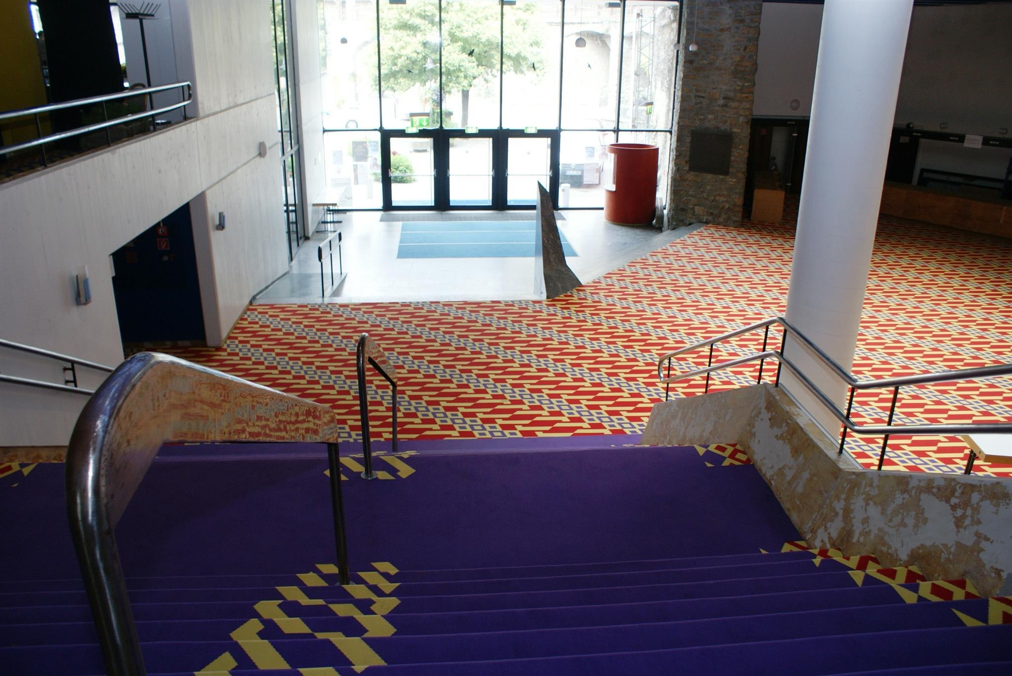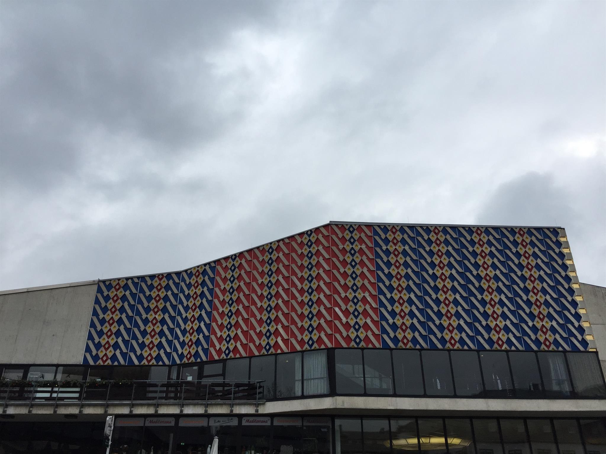 Hajek zeichnet sich verantwortlich für die Gestaltung der auffälligen Ornamentfassade aus farbigem Sichtbeton, die sich im Innern in der Wand-, Boden- und Deckengestaltung fortsetzt. Auch der Teppich im Inneren der Halle nimmt die Fassade in Form und Farbe wieder auf und besticht durch eine auffällige Optik.