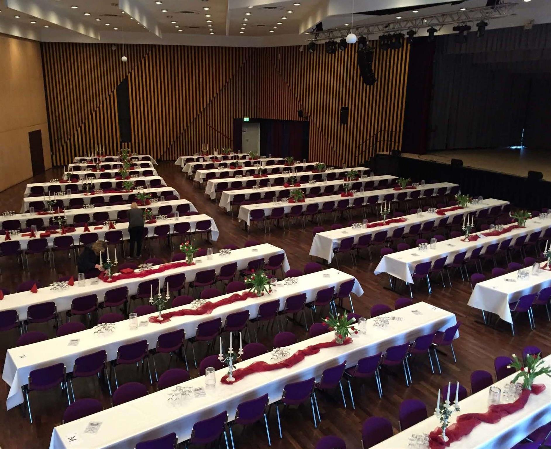Die in der Stadthalle für gesellschaftliche und gastronomische Zwecke befindlichen Räumlichkeiten verteilen sich auf mehrere Geschosse und sind durch Treppen sowie Personen- und Lastenaufzüge miteinander verbunden und somit barrierefrei.