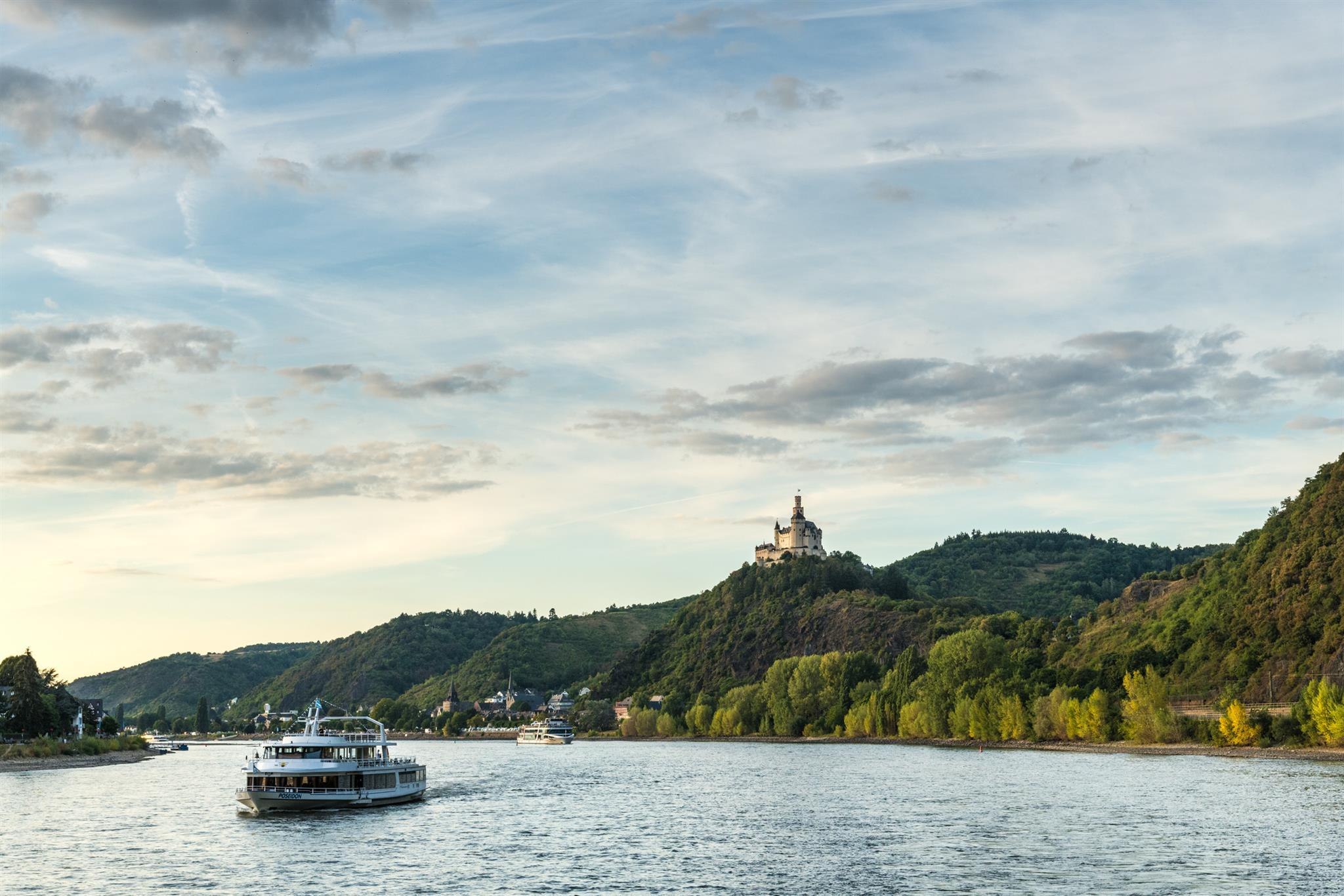 On the Rhine's right bank, upstream from its junction with the Mosel, a hill rises above the town of Braubach. Crowning the hill is Marksburg Castle, its unusually slender keep towering above the surrounding courts and ramparts. Beginning with the construction of the keep in the 12th century, the castle grew into its present shape throughout succeeding centuries. In the Middle Ages, the strengthening of the castle's defences became essential and urgent by improvements made to firearms. Huge outworks date from this time, as does the conversion of a gateway in the outer wall to a strong bastion. It is mainly due to these extra defence works that the castle was never seriously attacked. In more peaceful times, it was used mainly as a state prison. Now you can visit the most original castle in the entire valley of the Loreley. This impressive castle, home of the German Castles Association set up to preserve such ancient monuments, presents a host of fascinating artefacts that brings the Middle Ages to life.