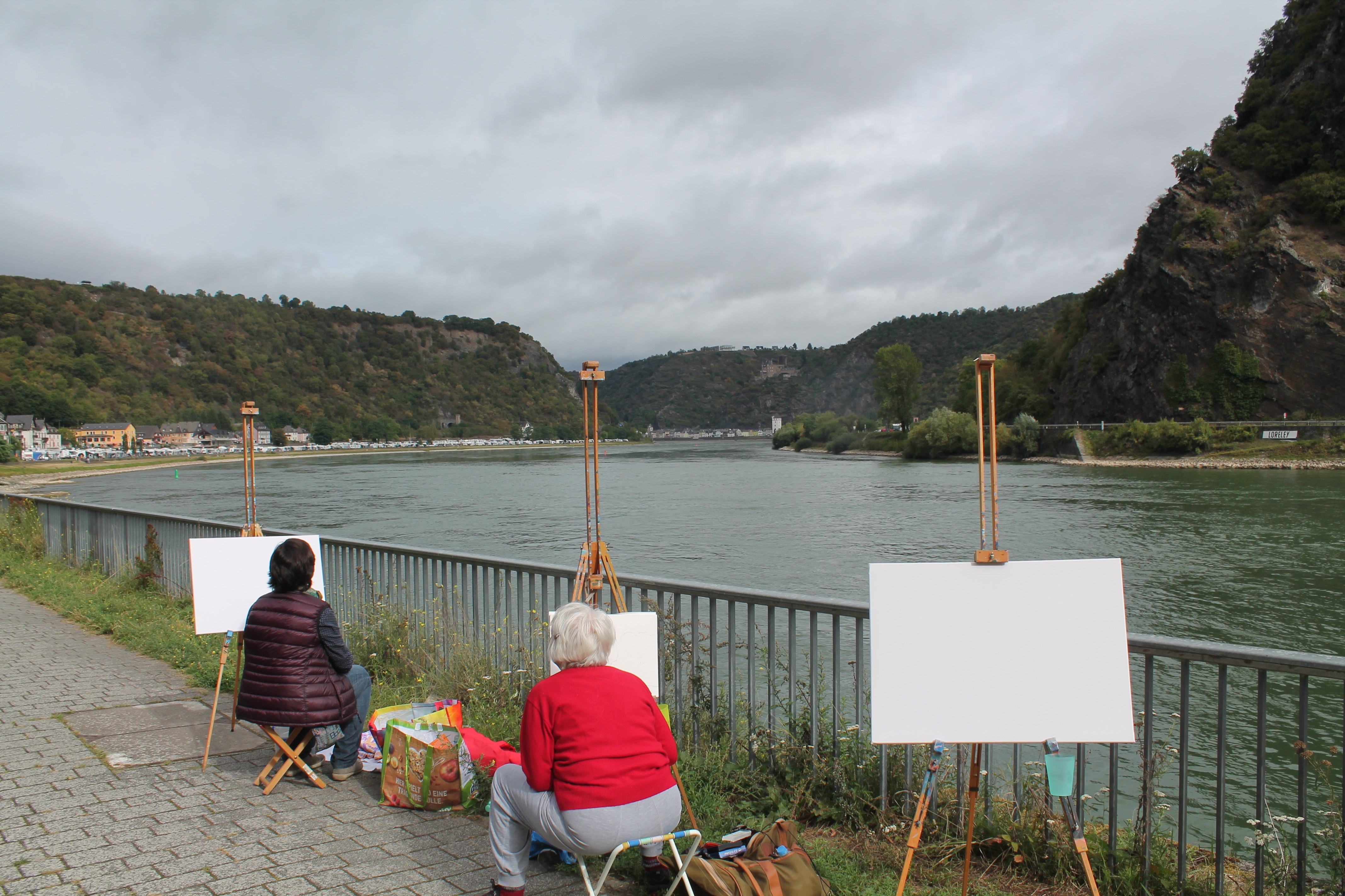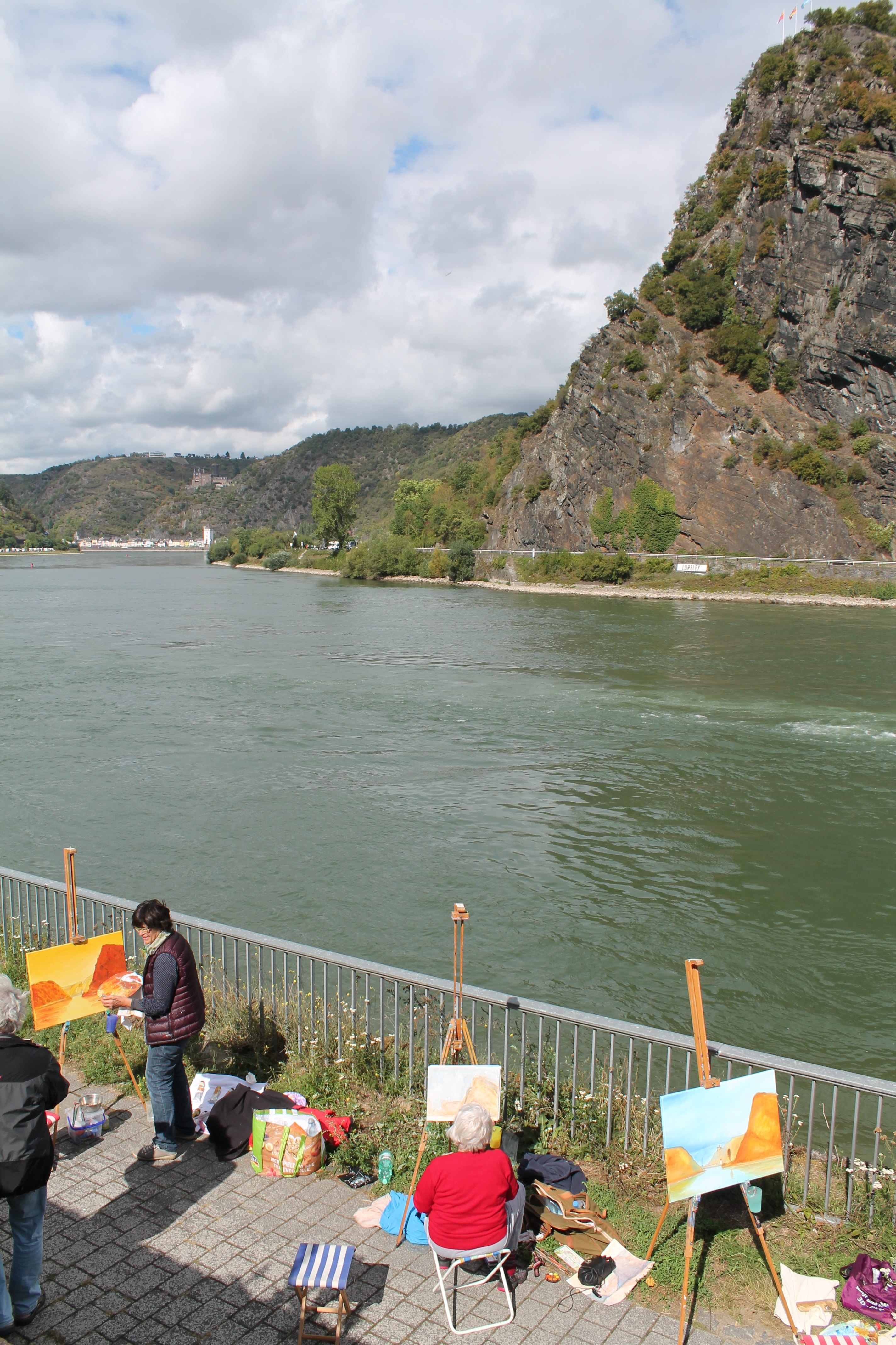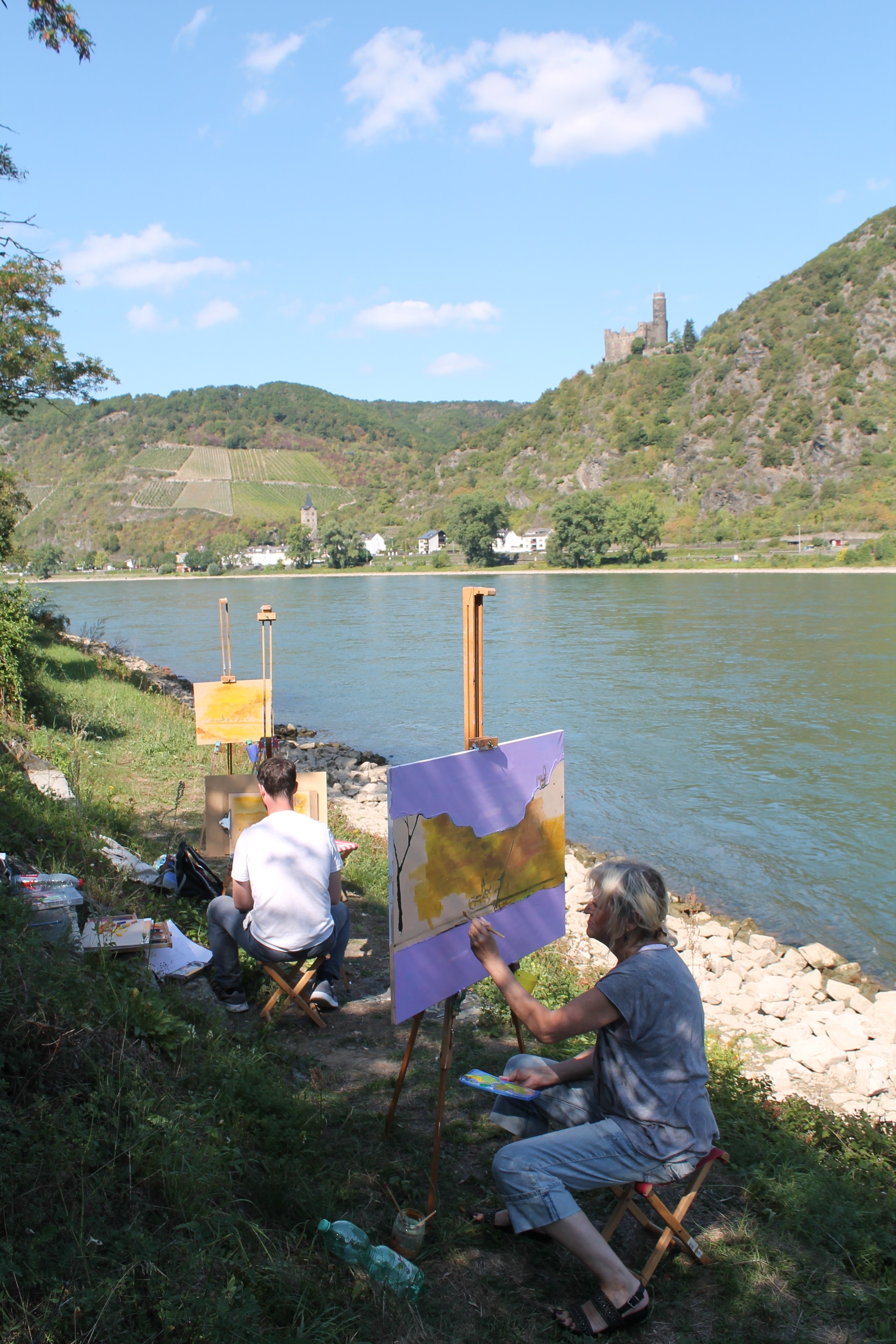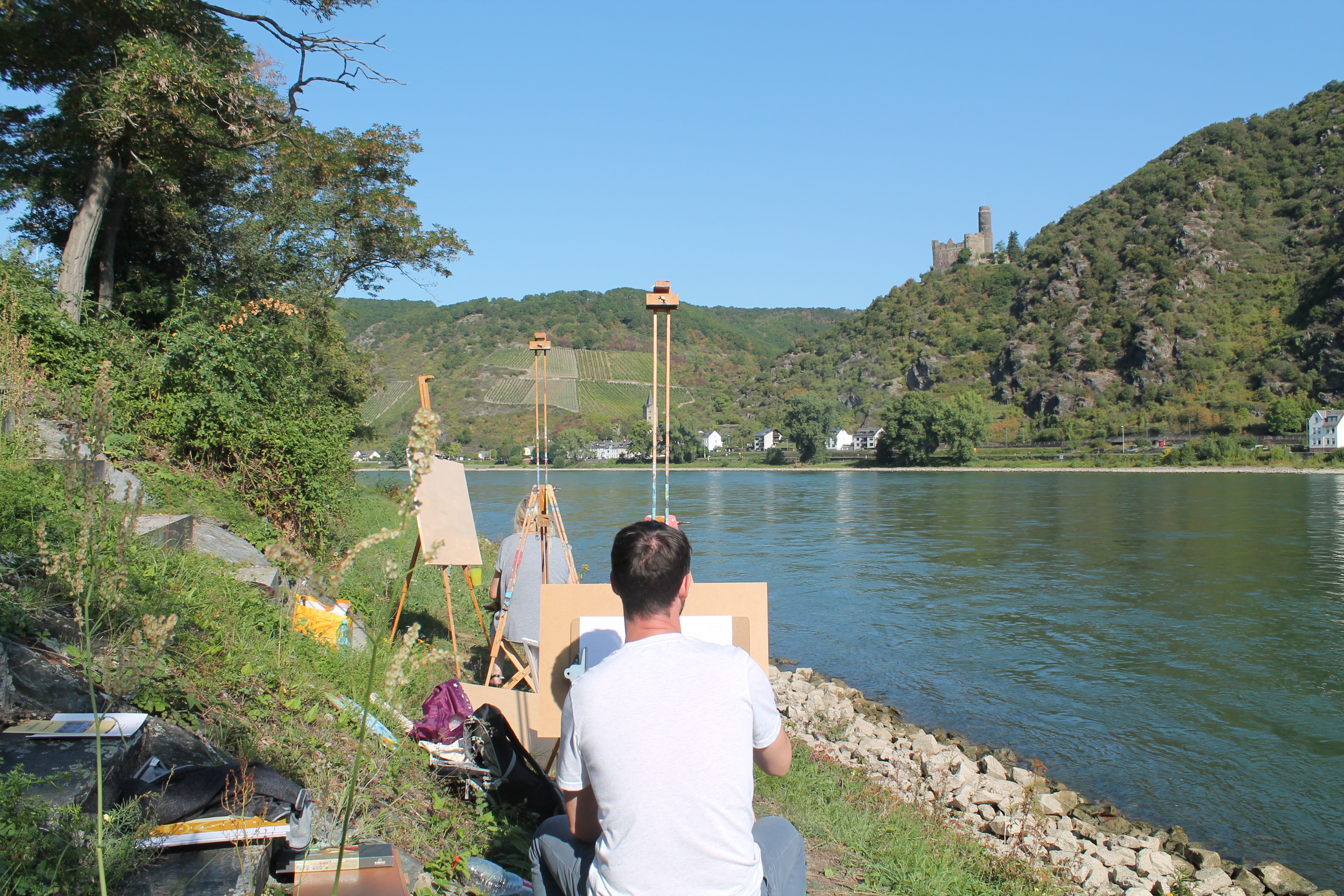 Angeleitet von Dr. Armin Thommes begaben sich die der Teilnehmer*innen des eintägigen Workshops an William Turners Malstandorte und bannten dort die herrliche Rheinlandschaft „auf die Leinwand“.